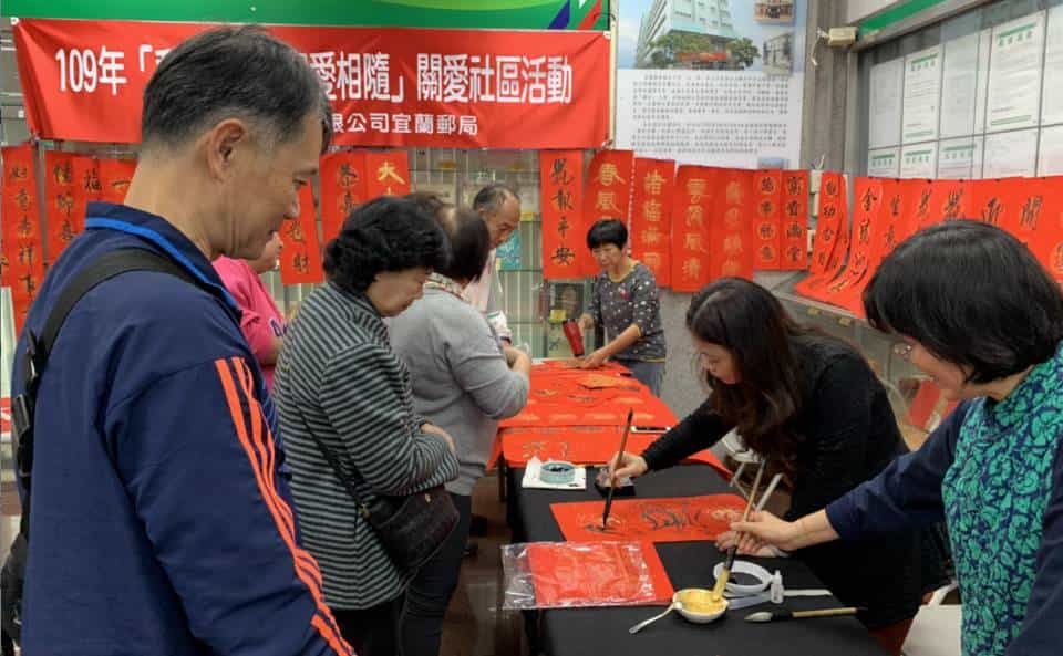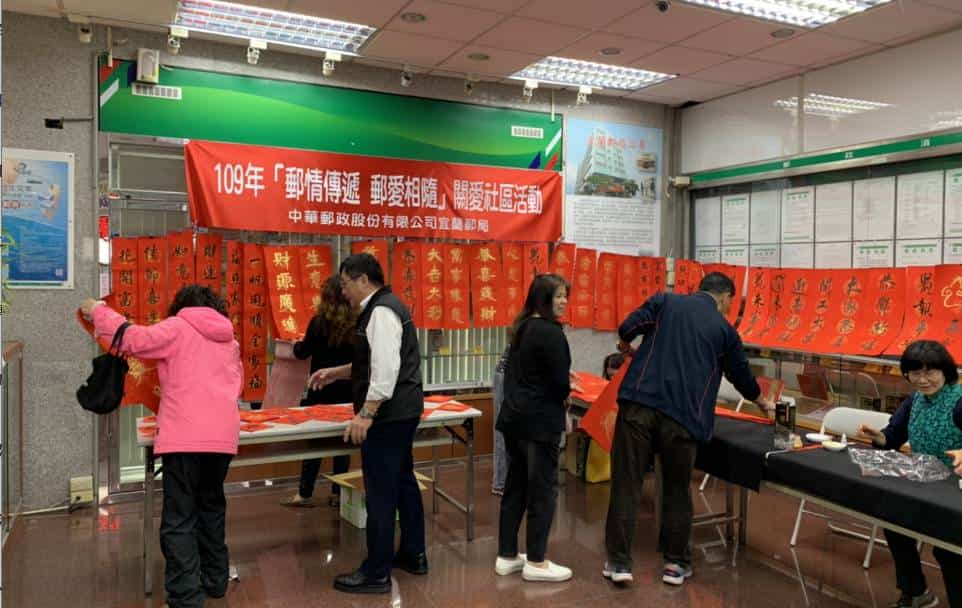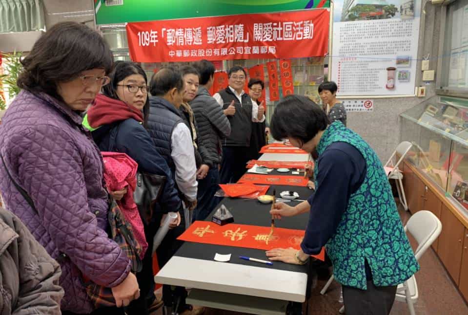 宜蘭郵局為迎新春於1月15日上午於宜蘭中山路郵局營業廳,辦理「庚子年金鼠賀歲送春聯」活動,特於109年邀請宜蘭名書法家林鈺雰老師等多位老師現場揮毫寫春聯,依客戶需求客製化書寫春聯,免費贈送用郵顧客,現場民眾都爭相索取,將具有年節氣息的春聯帶回家中居家佈置,增添年節氣氛,期許新年新氣象。