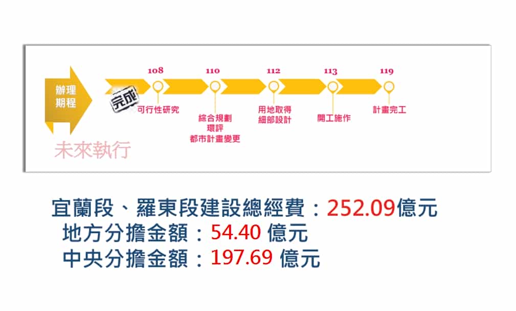 該案工程預計最快於113年動工,119年完成,總建設經費預估252.09億元,由中央負擔197.69億元、地方配合54.40億元,宜蘭縣民多年來殷殷期盼鐵路高架建設終於可望實現。