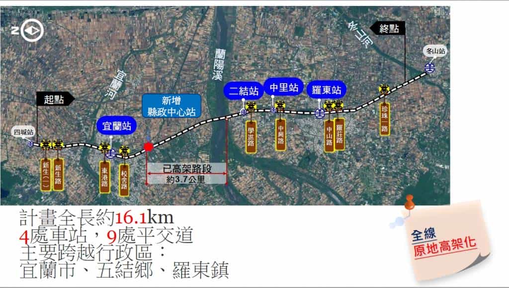此次鐵路高架計畫範圍為宜蘭至羅東段,全長約16.1公里,跨越宜蘭市、五結鄉及羅東鎮三行政區,包括宜蘭、二結、中里、羅東等四站,並將在計畫內新增一處縣政中心站,範圍內已竣工之高架鐵路長約 3.7公里 (校舍路以南至蘭陽溪),將以全線原地高架方式進行。
