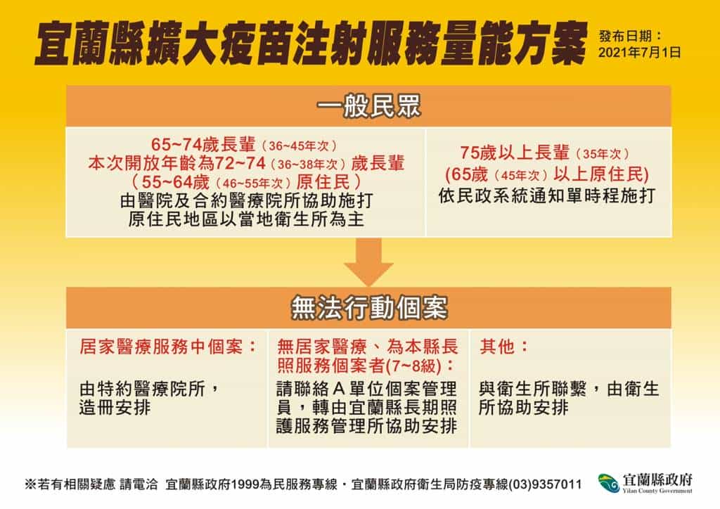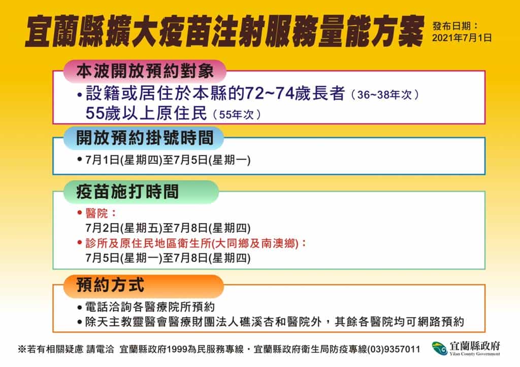 衛生局提醒,請75歲以上長者按照民政系統通知的時間,於7月2日至7月10日期間,至各接種中心、衛生所接種站完成注射服務。而72歲至74歲的民眾,可利用電話、網路預約向7家醫院及8家診所掛號,醫院及診所將安排適當時間提供疫苗接種服務。