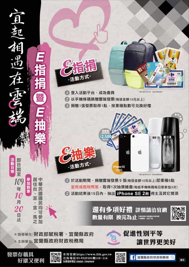 宜蘭縣政府財政稅務局為推廣捐贈雲端發票愛心做公益,自即日起至10月20日止,舉辦雲端發票「E指捐暨E抽樂」積點換好禮及抽獎活動,邀您一起在雲端相遇!