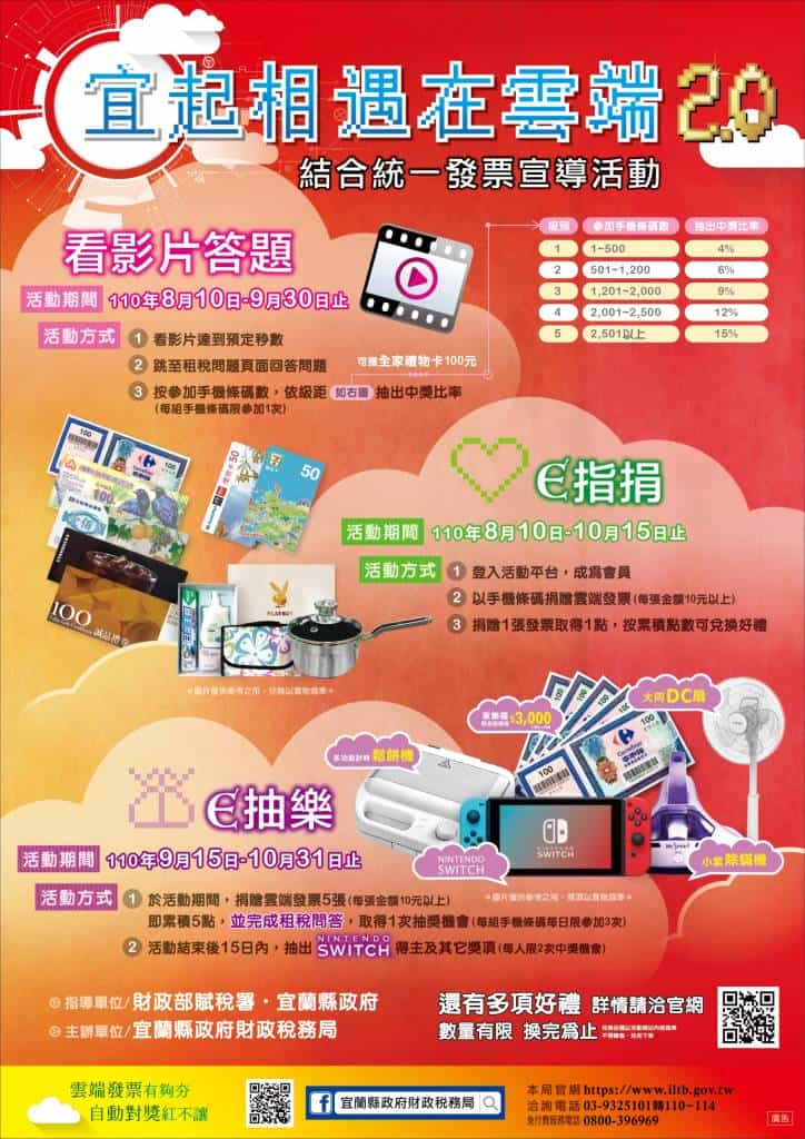 宜蘭縣政府財政稅務局為推廣捐贈雲端發票愛心做公益及增加租稅常識,自110年8月10日起,舉辦線上看影片答題、雲端發票「E指捐及E抽樂」積點換好禮及抽獎活動,邀您一起在雲端相遇!