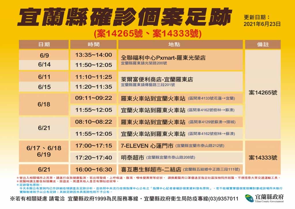 案14265為70多歲男性,是長年定居美國的退休人士。109年12月案妻參加美國教會平安夜聚餐,聚餐中有人確診,個案及案妻後有發燒、咳嗽等症狀,均確診。因症狀輕微,在居家隔離觀察未住院治療。個案及案妻於110年3月在美國居住地的藥局完成2次BNT疫苗施打。5月7日在美國居住地篩檢PCR為陰性,5月10日搭機回臺灣,即入住防疫旅館。之後在外縣市居家檢疫至5月27日,搭乘防疫計程車回宜蘭。原預計6月底返回美國,因出國要持離境前3天的檢驗報告,個案於6月21日自費採檢,報告結果為陽性,CT值29。該案在6月22日確診後,衛生局已匡列2位同住家人(案妻、案親友)為居家隔離對象並採檢,結果皆為陰性。