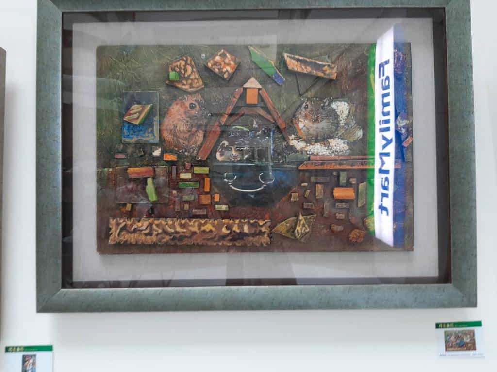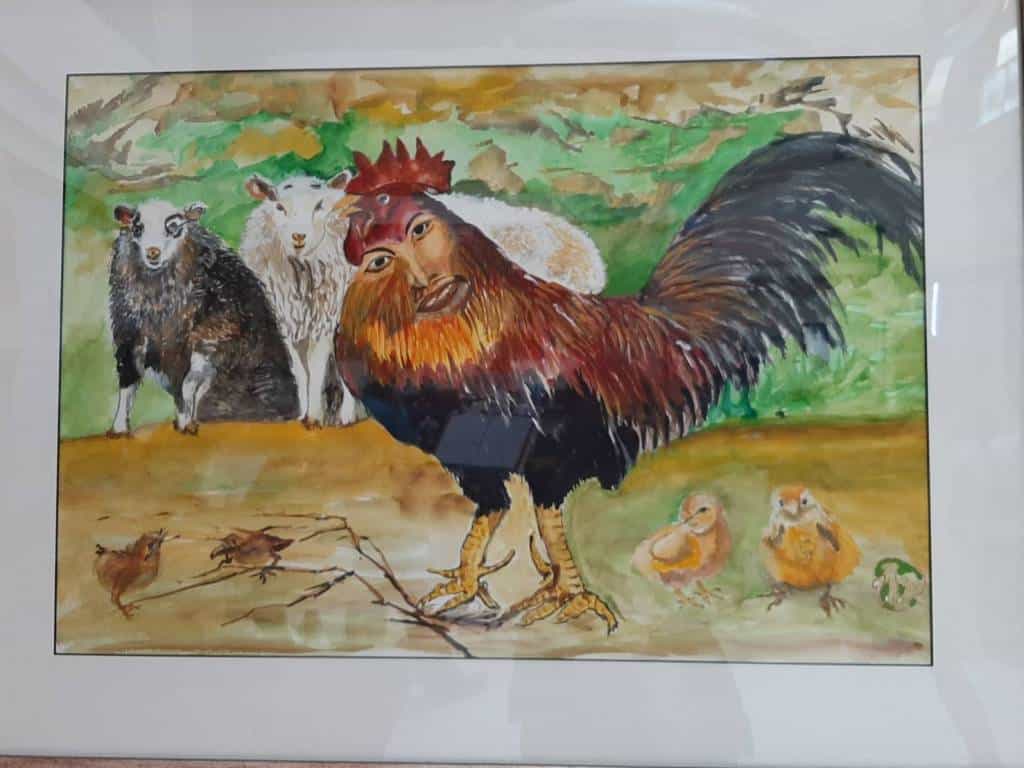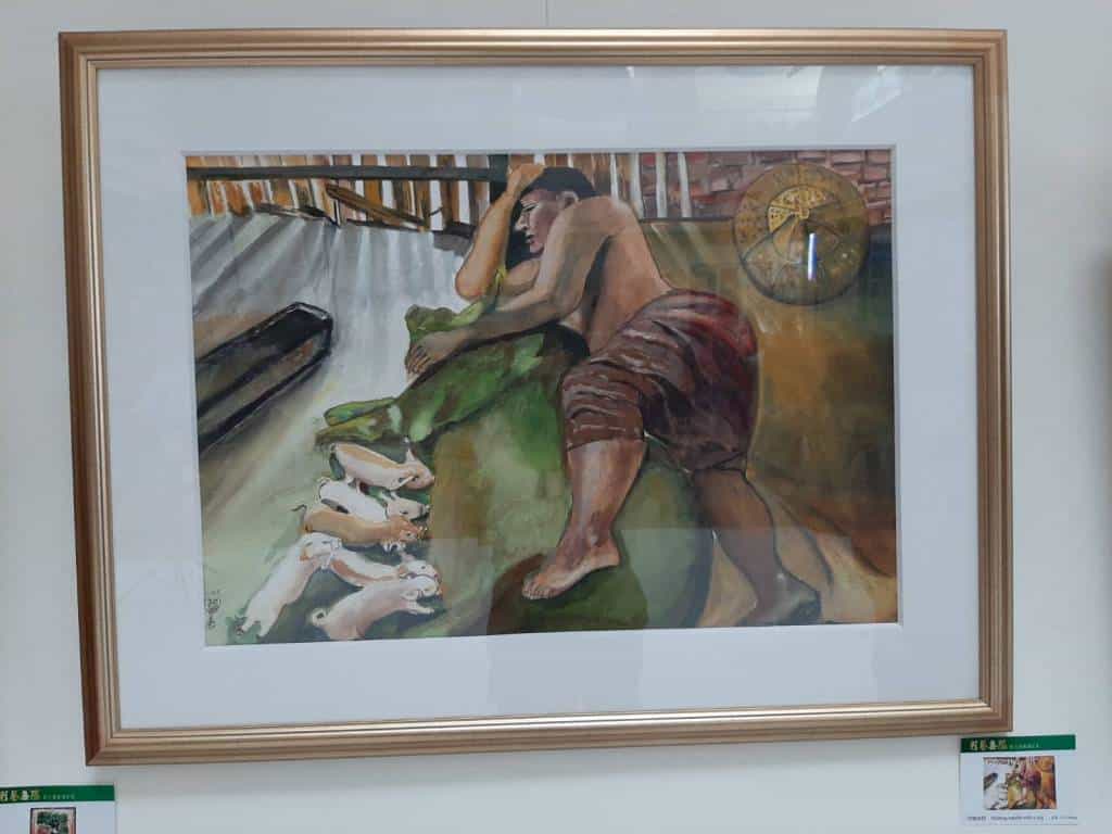 林碧雲又說,她的每一幅畫都有故事,有一幅母豬餵小豬的畫(上圖),母豬身上還躺了一個人,這是她小時候的記憶,因為躭心乳豬在吸奶時被母豬壓到,必須有人在旁邊守護。