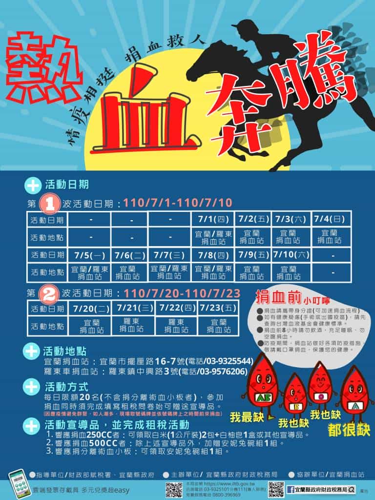 因COVID-19疫情影響,民眾減少外出,促使當前血液安全庫存量不足,自110年7月1日(四)起,宜蘭縣政府財政稅務局舉辦捐血做公益活動,號召健康的民眾在做好自我防護下一起盡一臂之力,藉此活動,同時宣導各項租稅常識及推廣使用統一發票兌獎APP索取雲端發票之環保觀念!