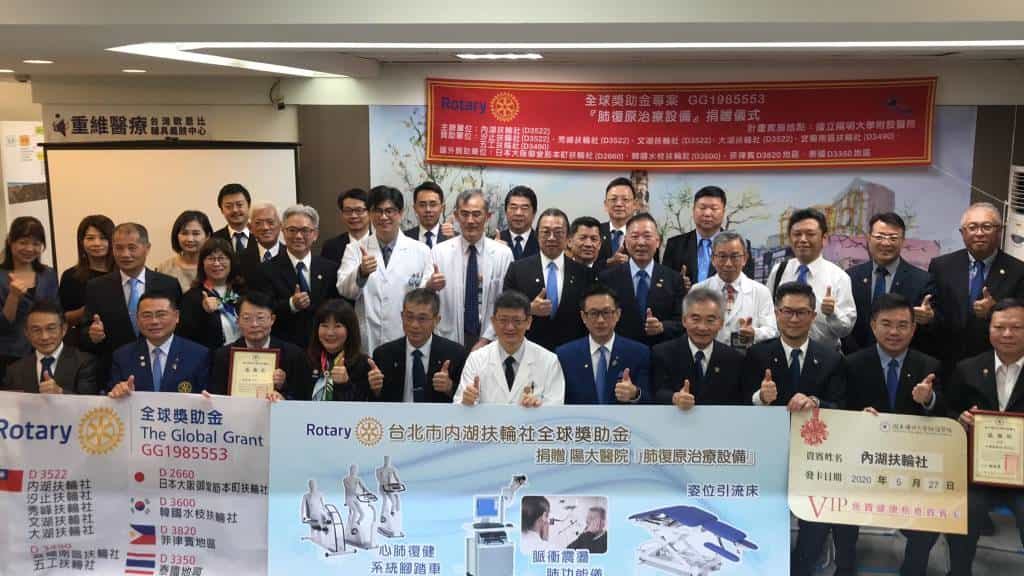 國際扶輪3522地區台北市內湖扶輪社劉耀斌社長表示:臺灣高齡化社會,慢性呼吸道疾病日趨攀升更是迫切,而扶輪社認同陽大醫院服務理念,為使陽大醫院呼吸胸腔照護團隊能對於宜蘭長者呼吸胸腔評估,心肺運動訓練有所助益,實踐預防醫學三段五級概念與六大焦點領域之預防及治療疾病,在本年度透過全球獎助金專案的計畫與執行,結合了國內分區社友、日本、韓國姊妹社及菲律賓與泰國扶輪地區的力量,幫助宜蘭地區慢性肺病病患接受更完善的醫療復健服務,獲得更佳的生活品質。