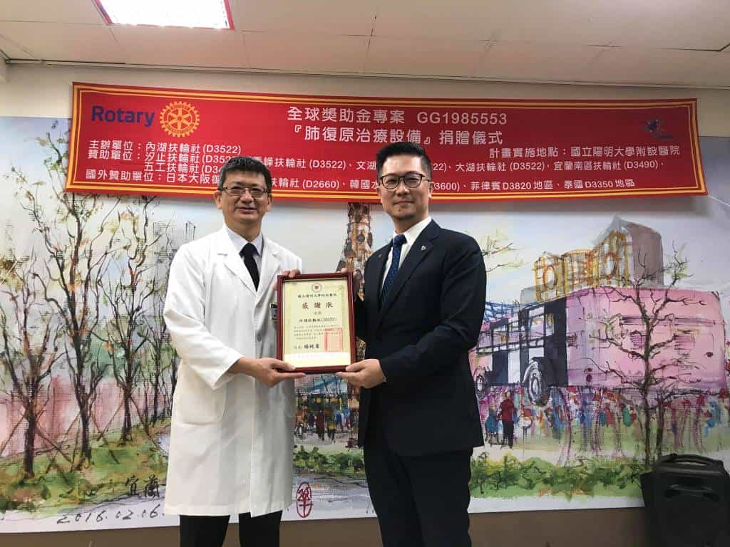 依據衛福部106年統計資料顯示,因罹患肺阻塞而死亡位居國人十大死因第七位,而宜蘭縣慢性下呼吸道疾病患者更高居全國第三名,陽大醫院有感於本縣呼吸胸腔疾病趨勢,可預期人口老化與肺阻塞情形日益嚴重,於該院設置胸腔復原治療室,並設計一系列胸腔復原運動,以改善慢性肺部病患者生活品質。而國際扶輪3522地區台北市內湖扶輪社認同陽大醫院服務理念,於今(27)日上午辦理愛心無國界~國際扶輪社「肺復原治療設備」捐贈典禮。
