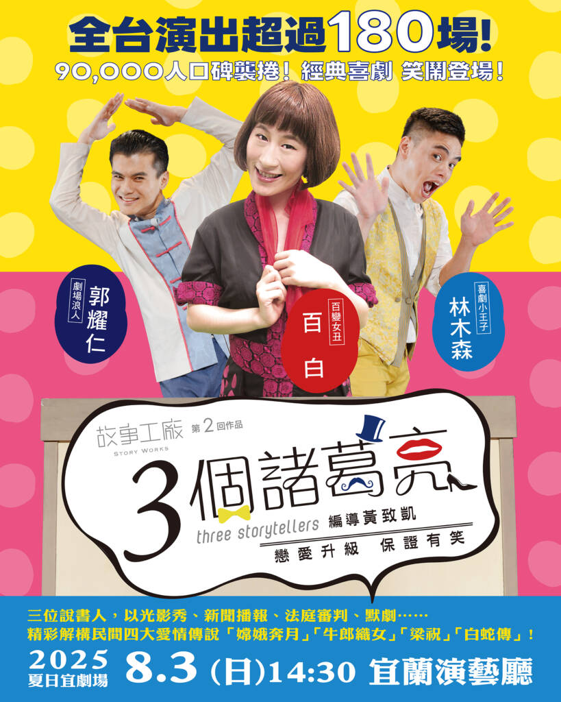 首場演出8月3日(日)由故事工廠經典喜劇《3個諸葛亮》打頭陣,本劇由故事工廠藝術總監黃致凱編導,並集結百白、郭耀仁、林木森三位頂尖笑星,飾演三名藝名皆為「諸葛亮」的說書人,化身觀眾的「愛情軍師」,以現代視角犀利解析民間四大愛情傳說—《嫦娥奔月》《牛郎織女》《梁祝》《白蛇傳》。劇中巧妙結合「約會AA制」、「控制狂伴侶」等當代議題,笑料中引人思考感情價值觀。其中段落〈嫦娥奔月之后羿射月〉已被選為康軒版國中課文,是一齣寓教於樂、闔家皆宜的喜劇。