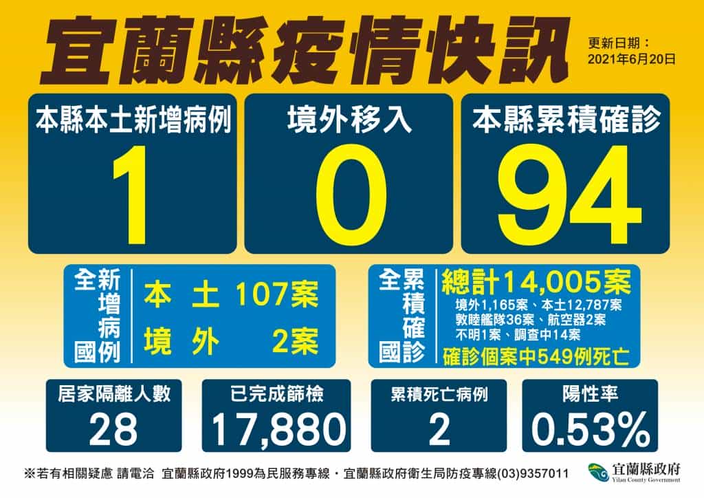 宜蘭今(20)日新增1例個案。縣長林姿妙表示,疫情嚴峻需要全 民共同努力,除了遵守各項防疫措施,民眾若主動去篩檢站採檢,務必保持通訊暢通,讓衛生單位必要時即時掌握,如違規定,依法重罰。