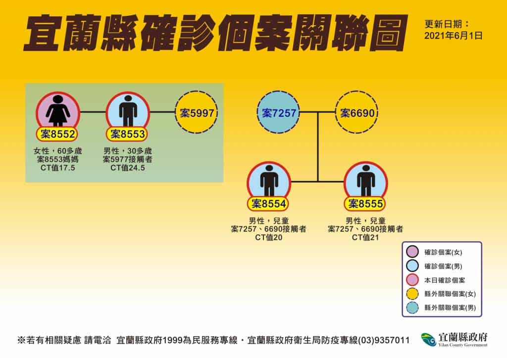 案8555也是一個不滿10歲的孩子,為案8554的兄弟。兩兄弟之前由家人帶回宜蘭,後來被列為居家隔離對象,採檢為陽性而確診,CT值21。