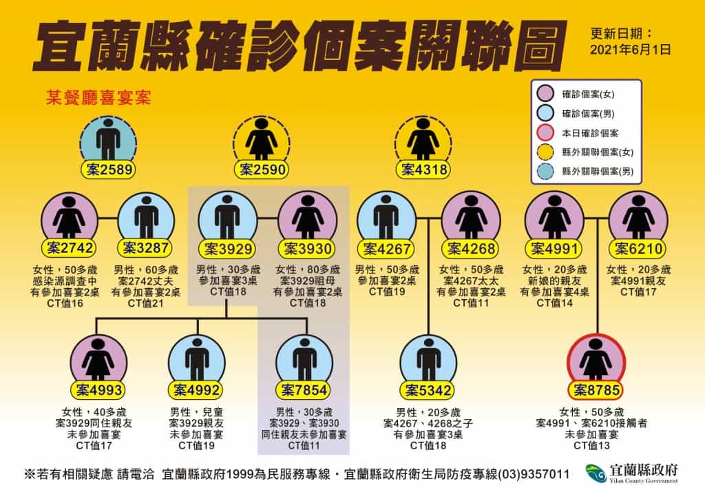 案8785是一個50多歲的女性,也就是某餐廳案確診者案4991的母親。案4991確診後,她就被列為居家隔離者,當時採檢為陰性。但5月31日出現咳嗽、流鼻水、發燒、腹瀉、頭痛等症狀再次採檢,結果為陽性而確診,CT值13。