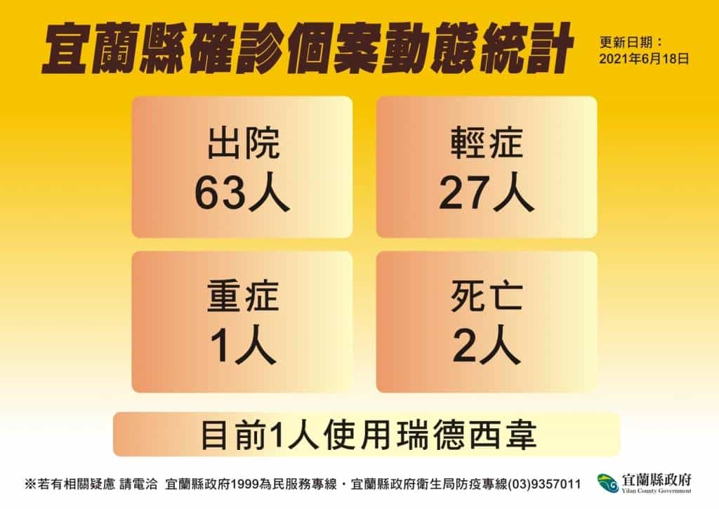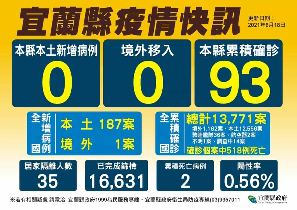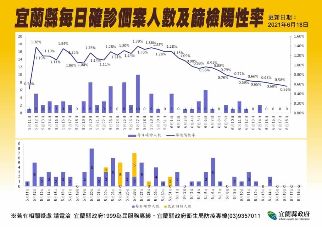 縣府表示,6月18日為止,本縣共有93人確診新冠肺炎,使用PCR篩檢16,631人次,也就是說為了找到1個確診個案,需要篩檢178人。另外,衛生局共匡列1,303位居家隔離者,平均每位確診者要隔離14個接觸者。這項工作雖然繁重,但相當程度穩定了宜蘭的疫情狀況。