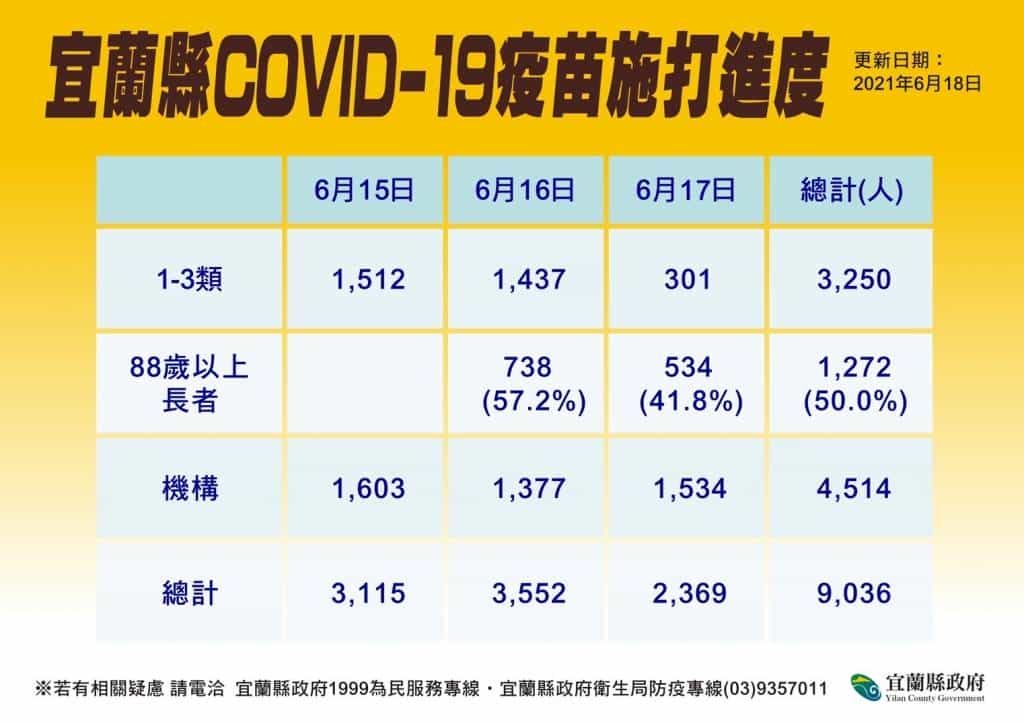 另外,縣府自6月16日下午開始,陸續為宜蘭縣88歲以上(原住民78歲以上)長者進行疫苗接種服務。截至昨(17)日晚上,已服務1-3類對象3,250人、88歲以上長者1,272人、長照機構4,514人,總共累計完成9,036人。目前為止,沒有接獲疫苗不良事件的通報。