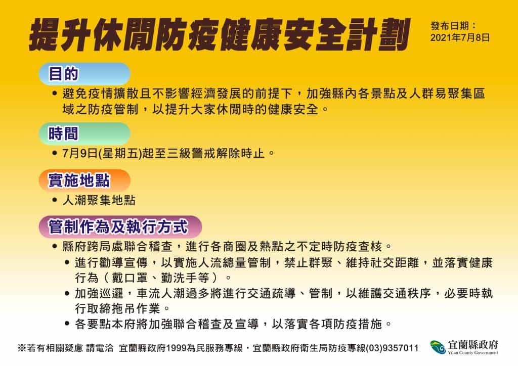 中央流行疫情指揮中心今天宣布三級警戒延長到7月26日,部分場域微解封。縣政府自明(9)日開始至三級警戒解除為止,執行「提升休閒防疫健康安全計劃」。