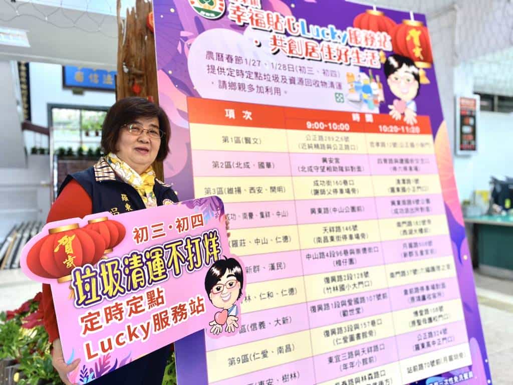 停收垃圾。1月25日-26日(農曆初一~初二):停收垃圾。1月27日-28日(農曆初三~初四):9:00-10:00及10:20-11:20定時、定點(11區、22個幸福貼心服務站)收運一般垃圾及資源回收物『詳如清運時間通知單』。晚間停 收垃圾。