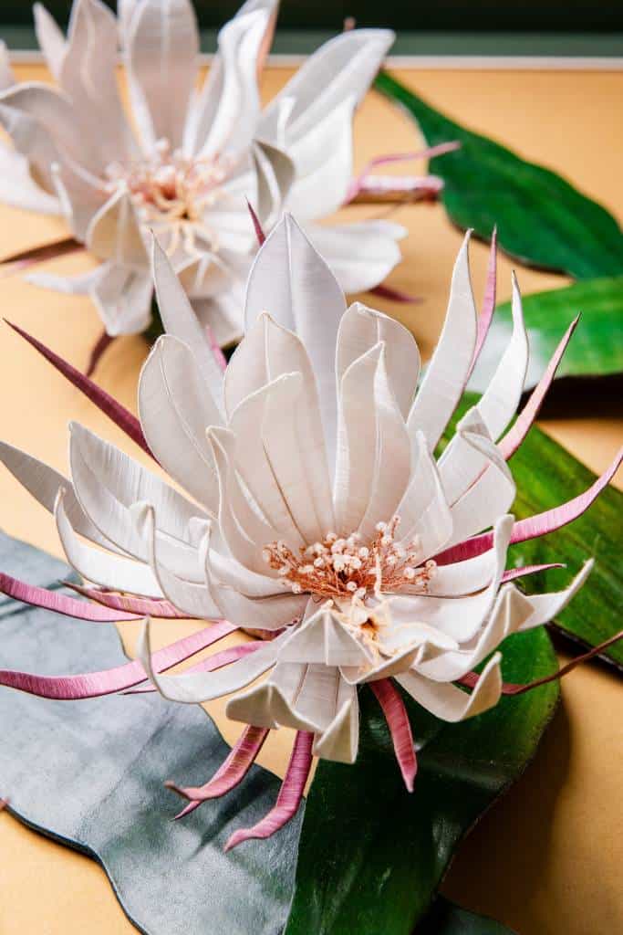 此次參展學生共有27人,來自全台各地,包括台中、彰化、台南及高雄,甚至連東部的花蓮也在其中,可謂遍地開花。今天開幕式中學生代表特別獻上花束感謝老師無私傳承,而陳惠美藝師也以恩師謝陳愛玉阿嬤所留下的春仔花"紙版"送給學生,象徵薪傳並期勉學生能繼續發揚纏花工藝文化,讓台灣傳統的生活文化永遠留傳。