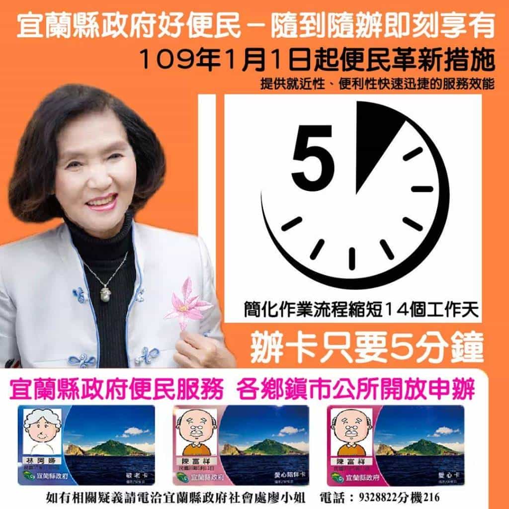 宜蘭縣政府貼心、用心建構長者及身心障礙者生活行無礙的環境,鼓勵老人及身心障礙者走出家庭,增加社會參與之機會,提升生活品質。次便民革新措施,簡化作業流程,大幅縮短14個工作天,辦卡只要5分鐘,提供就近性、便利性快速迅捷的服務效能,一起拚出宜蘭好生活。