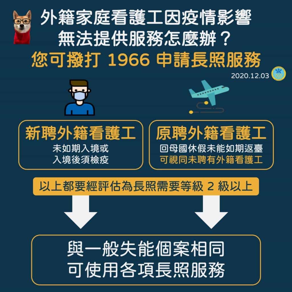 倘有失能者照顧需求,民眾可先申請使用長照服務,包含照顧服務(居家服務、日間照顧及家庭托顧服務)、喘息服務等;若印尼籍家庭看護工已入境來台而在居家檢疫或居家隔離期間,衛生福利部亦已放寬聘僱外籍看護工家庭使用照顧服務之條件,以因應這些家庭因疫情政策導致照顧人力空窗期。詳細訊息可洽宜蘭縣長期照護服務管理所官方網站(https://ltc.ilshb.gov.tw/)、撥打「1966」或親臨宜蘭縣長期照護服務管理所,由專人提供諮詢服務。