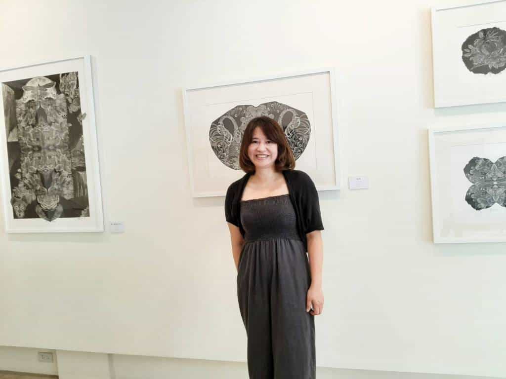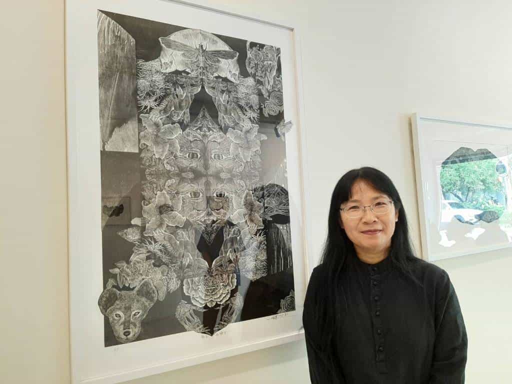 王鈴蘭從事水墨、書法創作多年,畢業於國立台灣師範大學美研所國畫創作組。此次「靜默」特展,她將把「毛筆」轉換成「推刀」,以木口木刻版畫作為創作的主軸,刀刻美感強烈,作品中的動物毛髮刻劃絲絲入微,花草樹木紋理精細清晰,畫面層次變化豐富!王鈴蘭認為木口木刻版畫是「推刀」與「木頭」的對話,在創作上,線條節奏猶如跳躍的音符,流暢卻擁有強烈的生命力。