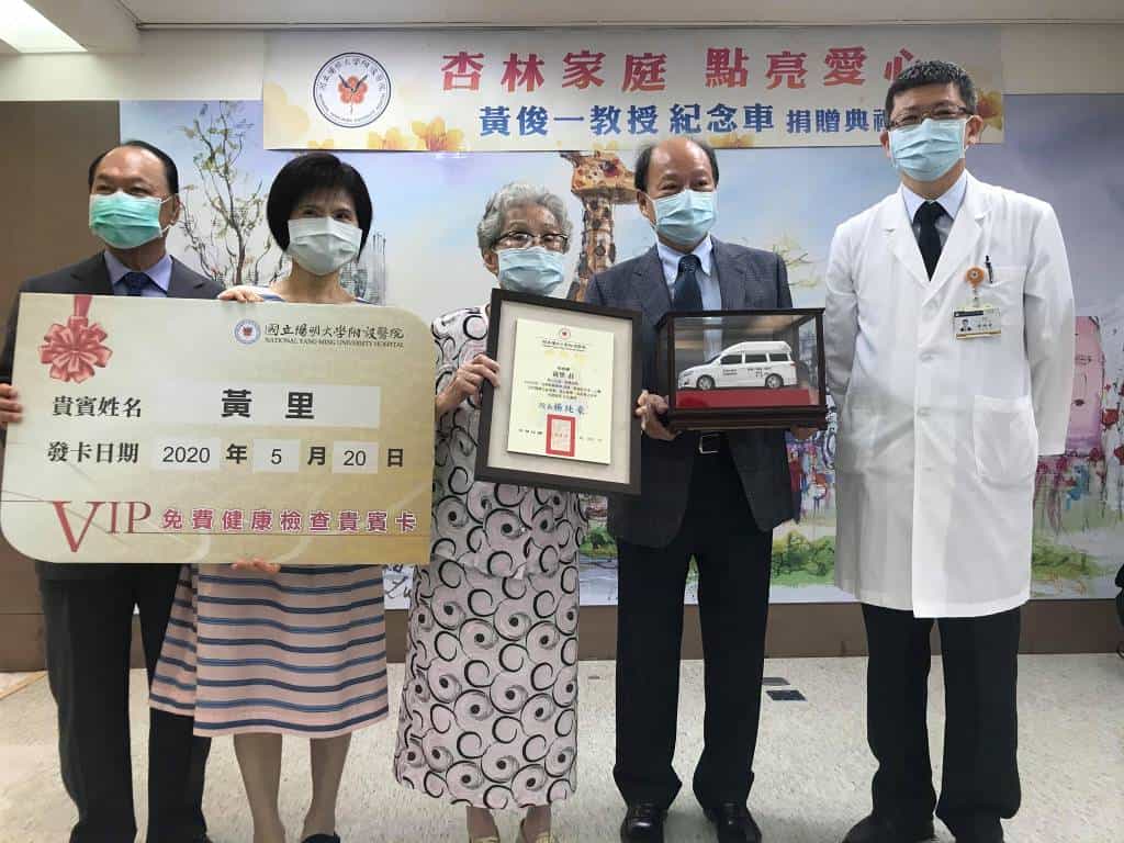 捐贈人黃女士大兒子黃俊一於去年過世,而現任其故鄉宜蘭的陽大醫院院長楊純豪,剛好是黃俊一教授在北榮神經外科的學生(楊院長當時為北榮住院醫師),且黃里女士感於曾在陽大住院就醫期間,受到前院長羅世薰醫師、蔡秉晃醫師等及醫護團隊悉心照護,尤其近幾年間於門診時蔡秉晃醫師及楊純豪院長也總是非常用心照護,所以黃里女士特別選擇該院為捐車對象,並以「黃俊一教授 紀念車」為捐贈車名,黃金浤與黃里為捐贈者。