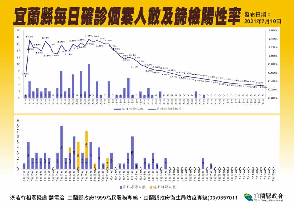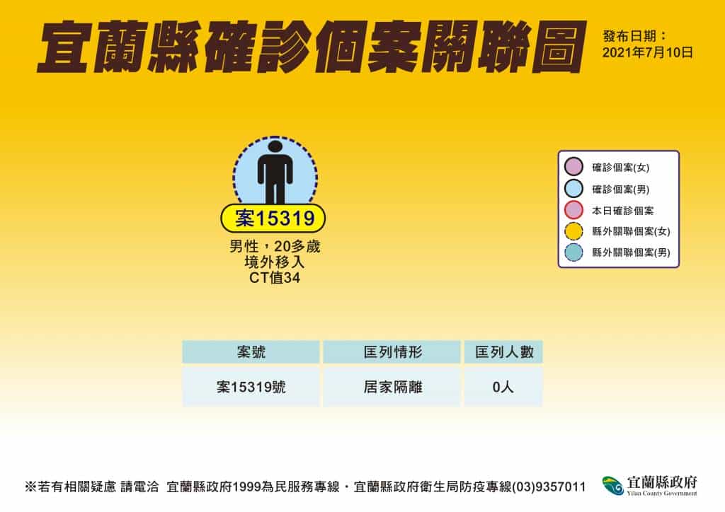 這名境外移入的案15319是20多歲男性,5月19日曾在國外因咳嗽及喉嚨痛而確診,當時CT值15.3;經休養恢復後,因有公務待辦,6月26日持3日內陰性檢驗報告搭機返台。抵達台灣後,搭乘防疫計程車回到宜蘭自宅居家檢疫,7月9日由衛生局安排搭乘防疫計程車進行居家檢疫期滿前的採檢,結果為陽性而確診,CT值為34。衛生局疫調顯示,該名個案返台後確實遵守1人1戶居家檢疫的規定,且期滿時依衛生局安排採檢,因此沒有任何的足跡,也沒有匡列相關的接觸者。