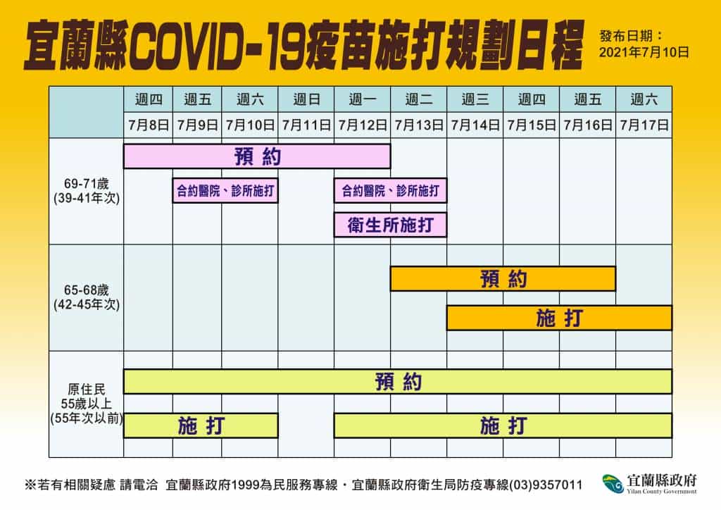 至於疫苗施打進度方面,目前開放69歲至71歲民眾可到合約醫院及診所施打,7月12日(星期一)起,民眾也可到12鄉鎮市衛生所施打疫苗,預計7月13日(星期二)施打完畢。7月13日同一天,也將開放所有的合約醫院、診所及衛生所接受65歲至68歲的民眾預約接種疫苗,預定7月14日(星期三)開始施打,7月17日(星期六)施打完畢。55歲以上的原住民也預計7月17日前完成施打。