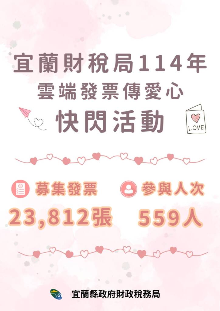 宜蘭縣政府財政稅務局於114年11月25日至同年12月26日間辦理的「雲端發票傳愛心,歲末好禮兌起來!」活動已圓滿落幕,在縣民朋友的熱心支持下,發票募集成果亮眼,共計559人次參與,募得2萬3,812張雲端發票,充分體現蘭陽鄉親滿滿的愛心與行動力!