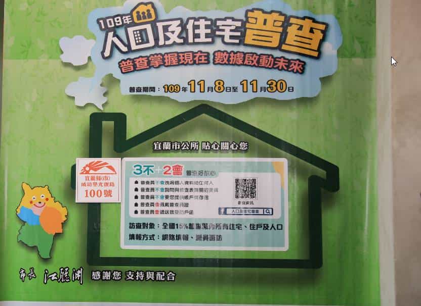 每10年一次的人口及住宅普查即將熱鬧登場囉!宜蘭市公所已成立宜蘭縣宜蘭市人口及住宅普查所,成立期間至110年1月15日。實地訪查工作於109年11月8日至109年11月30日止。普查員會堅守「3不+2會」之訪查原則,所謂「3不」係指普查員「不會」洩漏個人資料給任何人、「不會」詢問與普查表無關的資料、「不會」要您提供帳戶或存摺;「2會」則係指普查員「會」佩戴普查員證、「會」遞送致受訪戶函