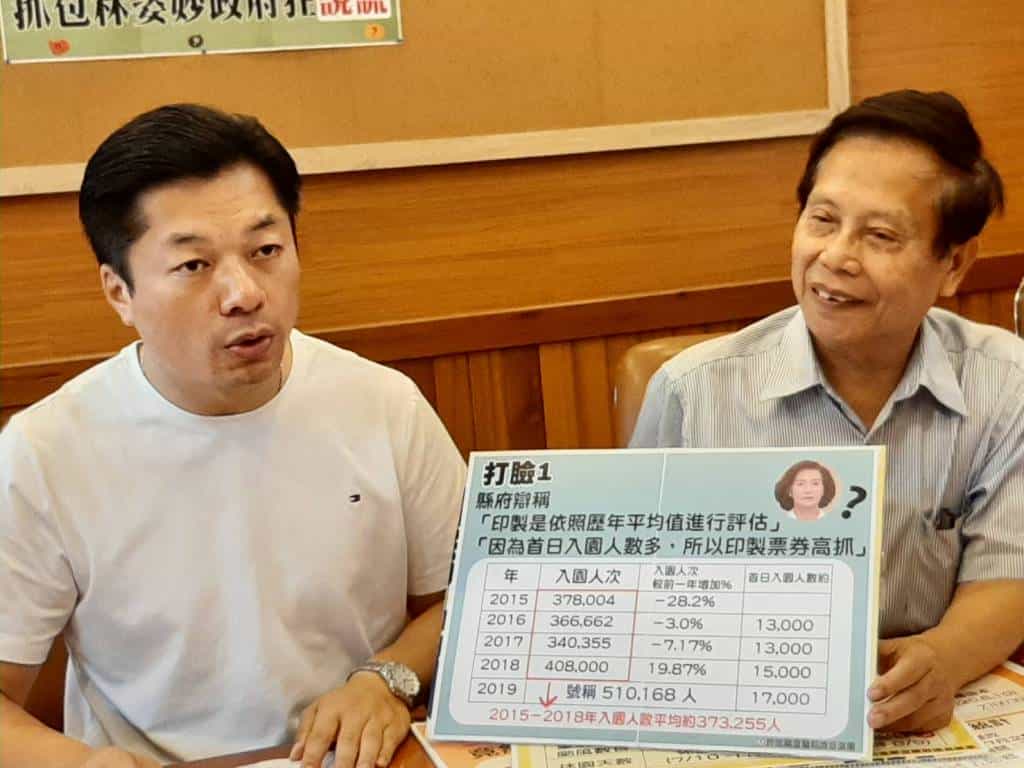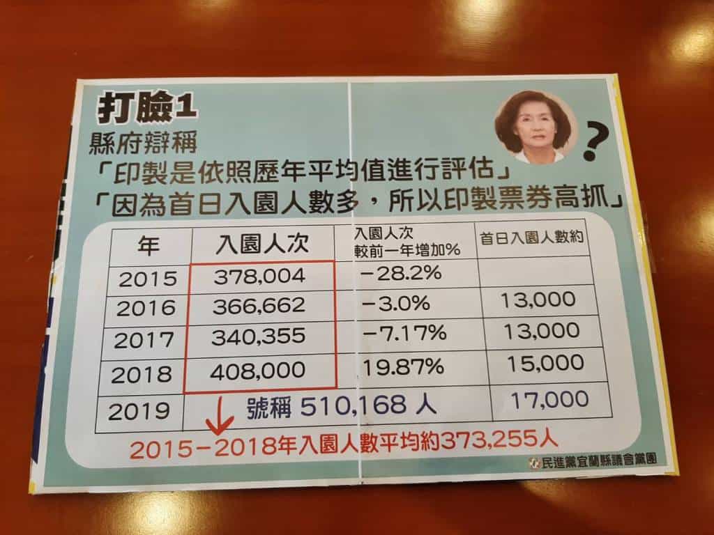 第一、「印製是依照歷年平均值進行評估」、「因為首日入園人數多,所以印製票券高抓」。2015年到2018年平均人次也才37萬多人,縣府稱67萬張票依照 歷年平均值根本胡扯,也才會使得多抓的票券最後銷毀了七成多賣不出去的35 萬張紙本票券。而縣府也宣稱,多抓人數係因首日入園人數多使估計總入園人數樂觀,但黨團調出數據發現,首日入園人數僅比前一年多兩千人,所以縣政府辯稱以歷年平均人次或首日入園人次來預估都是不合理的。