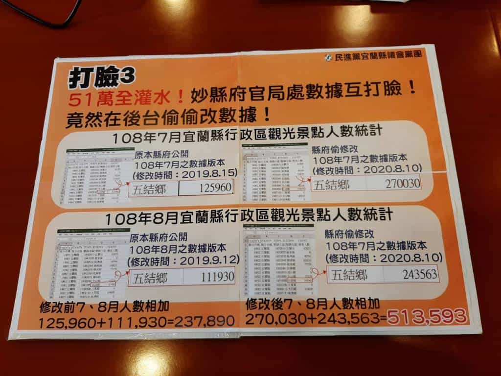 第三、51萬全灌水!妙縣府官局處數據互打臉,竟然在後台偷偷改數據! 根據黨團上週五8/7(1700時)從宜蘭縣社會經濟統計平台(宜蘭縣政府管理)下 載之公開統計資料:《108年7月宜蘭縣行政區觀光景點人數統計》與《108年8 月宜蘭縣行政區觀光景點人數統計》中可見數據,108年7月童玩節所在的位置五結鄉,觀光人次7月為12萬5960人、8月為11萬1930人,加起來一共不過23萬7 890人,此數據還是包含同在五結鄉之國立傳藝中心,與宜蘭縣政府所宣稱光童玩節總入園人次有51萬人次有嚴重落差。但令人痛心的事,先就針對黨團發現宜蘭縣政府於週一上午(九時),悄悄變更修改統計數據資料,將五結鄉入園人數進行修改為符合對外所宣稱之51萬人,且把最後修改時間保留在去年八、九月。 這不是造假數據、做賊心虛是什麼?浮報數據、迴避質疑而任意修改數據,錯估的人數恐引起民間業者過度樂觀的投資,政府的不誠實不僅傷害了台灣在地 因童玩節受益的民宿與觀光業者,更傷害了廣大宜蘭縣民對政府的信任。