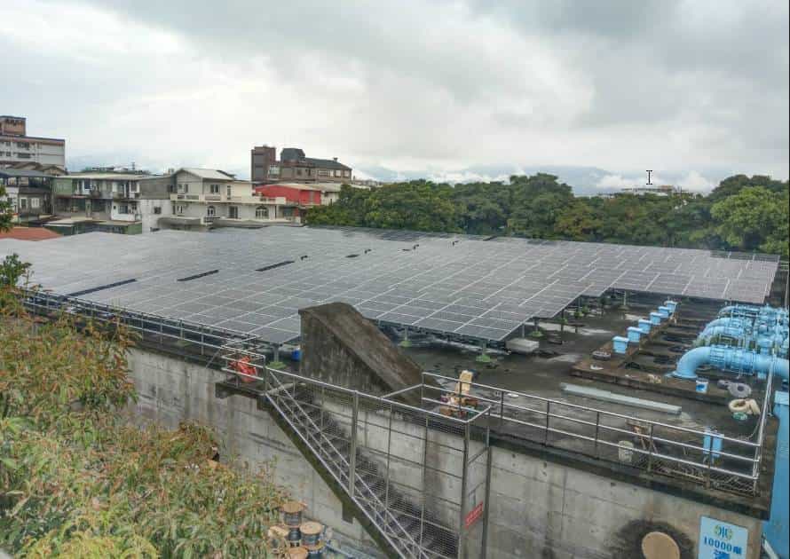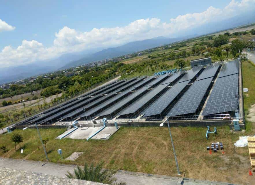 自來水公司第八區管理處亟致力於永續能源-太陽能的推動,太陽光電為具有 發展潛力的永續能源亦為兼顧環保、生態之潔淨發電方式,於管轄之廣興淨水場及清洲淨水場清水池池頂裝設太陽能板, 每年約可產生 95 萬度電,約為二百戶一年的用電量,為再生能源出一分心力,並為下一代子孫保留一潔淨的生存空間。