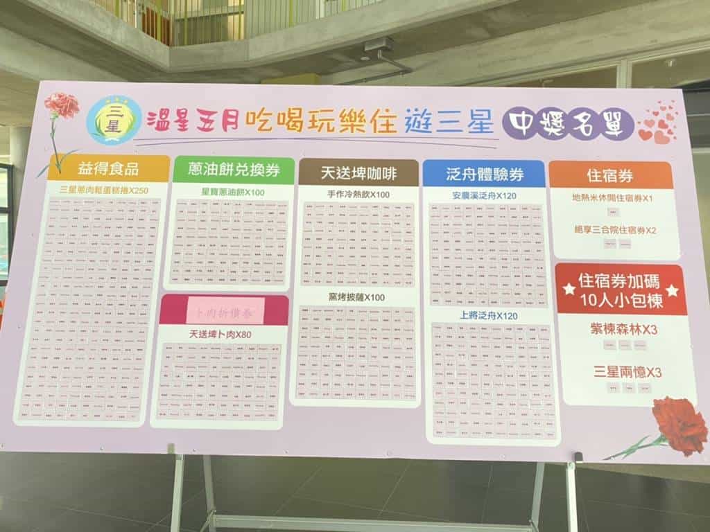 此次活動兌換及使用期間自即日起至5月31日,得獎者請於上班時間至三星鄉公所觀光產業發展所兌換。