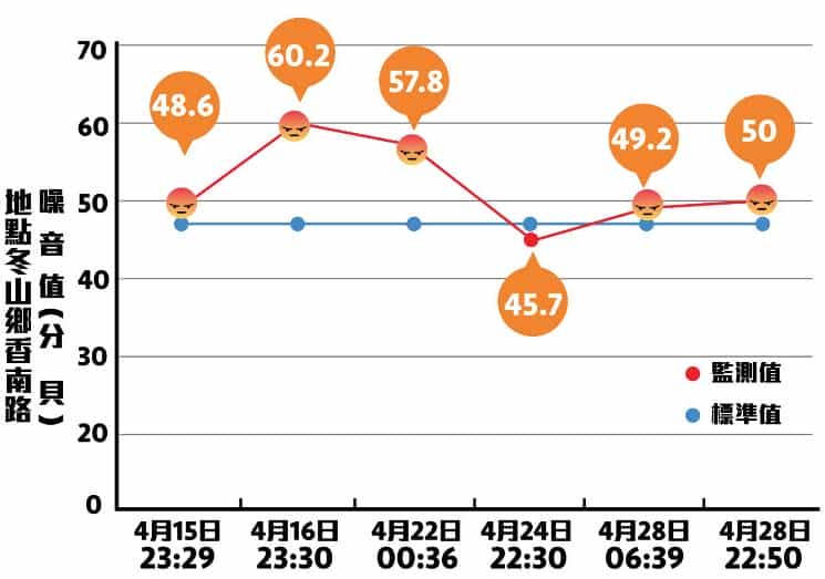 依照「噪音管制標準」,冬山鄉都市計畫區內住宅屬第二類噪音管制區,為供住宅使用為主且需要安寧之地區,夜間標準值為47分貝,而從108年起,居民陸續向宜蘭縣環保局檢舉,潤泰水泥廠的夜間噪音屢屢超過標準值,不見改善。本月4/15至4/28兩周內居民檢舉了6次,1次接近標準值,3次超標,2次嚴重超標。