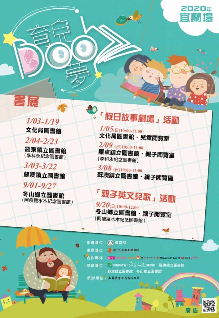 宜蘭縣政府文化局圖書館,配合國立公共資訊圖書館辦理「育兒BOOK夢」主題巡迴展,為新手爸媽推薦200本好書與資訊介紹海報展示等,巡迴展自109年1月3日起至3月22日止,分別於文化局圖書館、羅東鎮立圖書館(李科永紀念圖書館)及蘇澳鎮立圖書館等地展出,另於109年9月1日至9月27日期間,在冬山鄉立圖書館(阿瘦羅水木紀念圖書館)展出。歡迎大朋友、小朋友一同攜手來圖書館閱讀觀展。