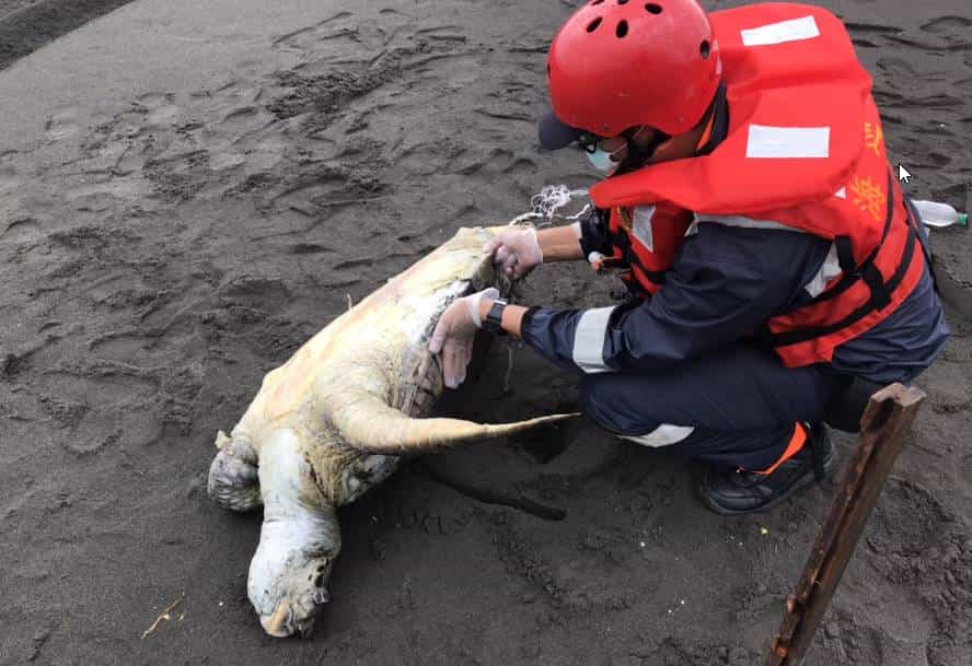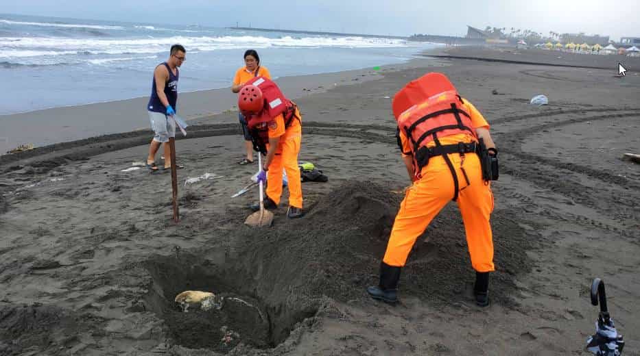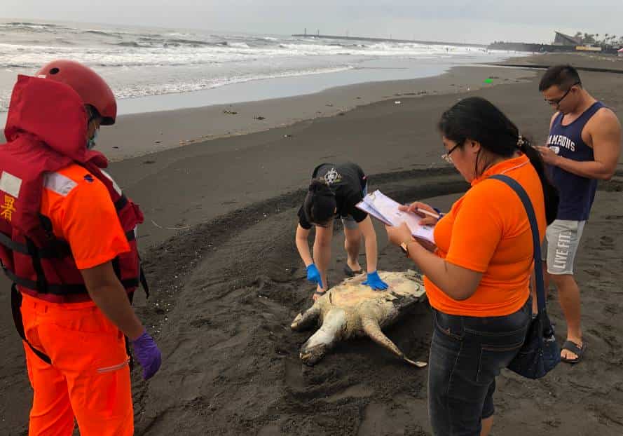 第二機動巡邏站接獲通報,立即派遣線上巡邏組前往現場處置,抵達烏石港外澳沙灘後,發現一隻背下腹上的死亡海龜橫躺於沙灘上,海巡人員以拍照方式提供宜蘭縣政府農業處畜產科及國立臺灣海洋大學協助辨識,確認該死亡海龜品種為綠蠵龜,其背甲長約為80公分、寬62公分,目前無法辨明死因亦無其他研究價值,經宜蘭縣政府農業處人員同意後,由海巡人員將死亡海龜於現地實施掩埋。