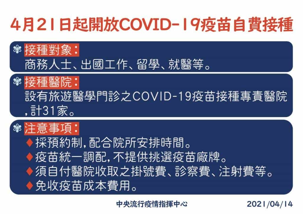 中央疫情指揮中心日前宣布,COVID-19疫苗自(21)日起,開放供民眾自費接種。若民眾為商務、出國工作、留學及就醫者,可前往疫苗接種專責醫院自費接種,全國限量開放1萬劑,請有需求的民眾儘快與責任醫院預約。另提醒民眾,完成COVID-19疫苗接種後,仍應遵守防疫新生活原則,勤洗手、佩戴口罩、保持社交距離,以降低感染風險,確保自身健康。針對疫苗接種相關事宜,縣長也指示衛生局務必進行縝密的規劃、調控機制及因應措施,務必讓得來不易的疫苗發揮最大的效益。
