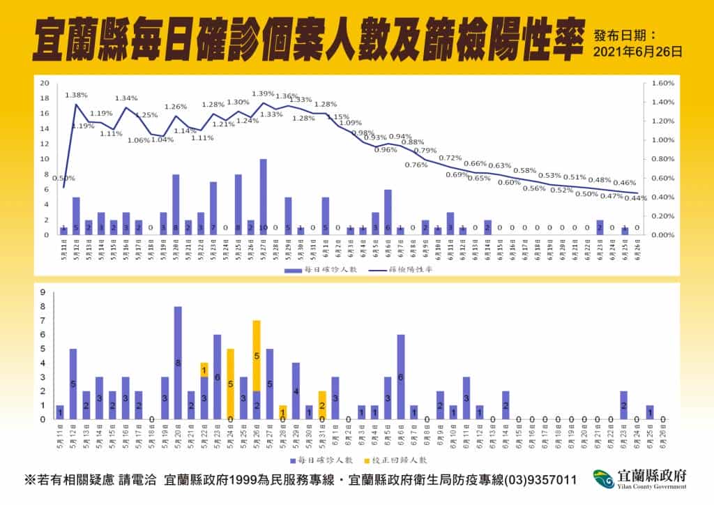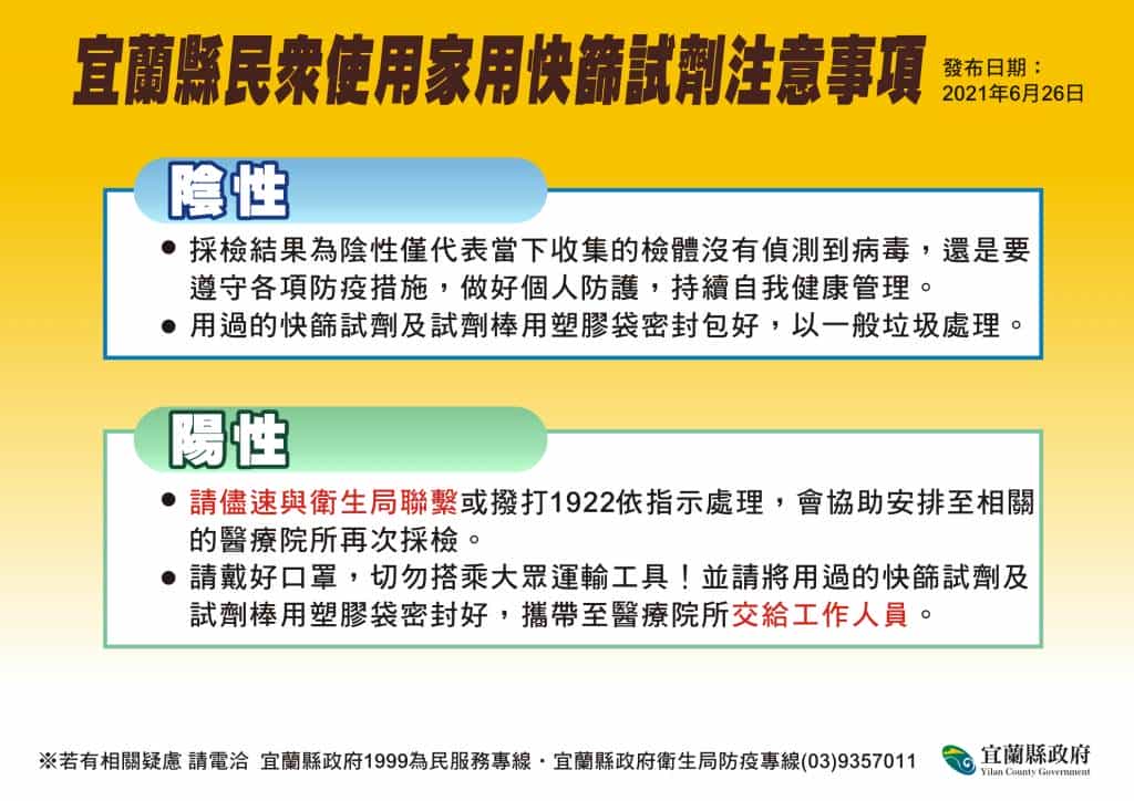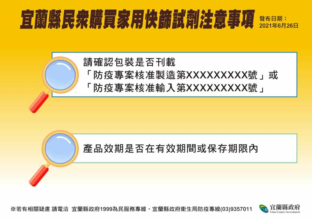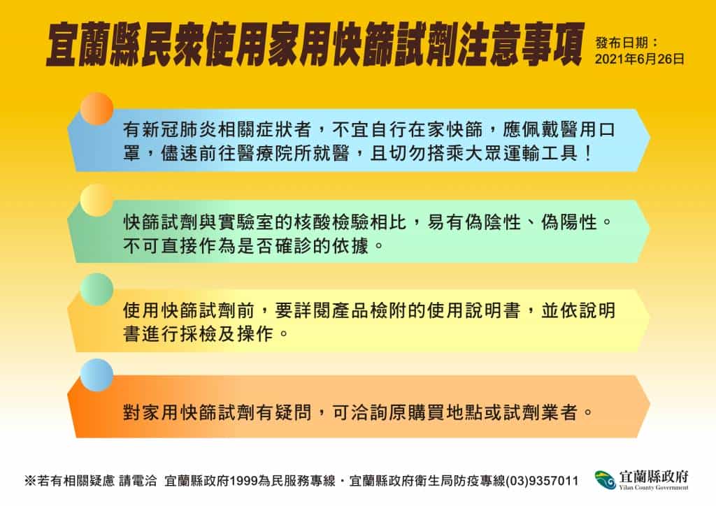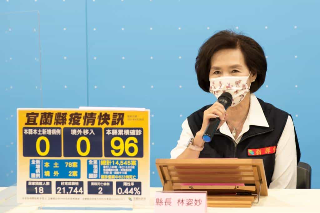 宜蘭今(26)日無新增個案。宜蘭縣林姿妙縣長表示,第一梯次疫苗殘劑電話預約已額滿,昨(25)日共施打36人,後續將視疫苗注射狀況,滾動式開放接種名額。林縣長也提醒民眾,留心使用家用快篩試劑的流程與注意事項,另購買防疫酒精也要注意相關標示。