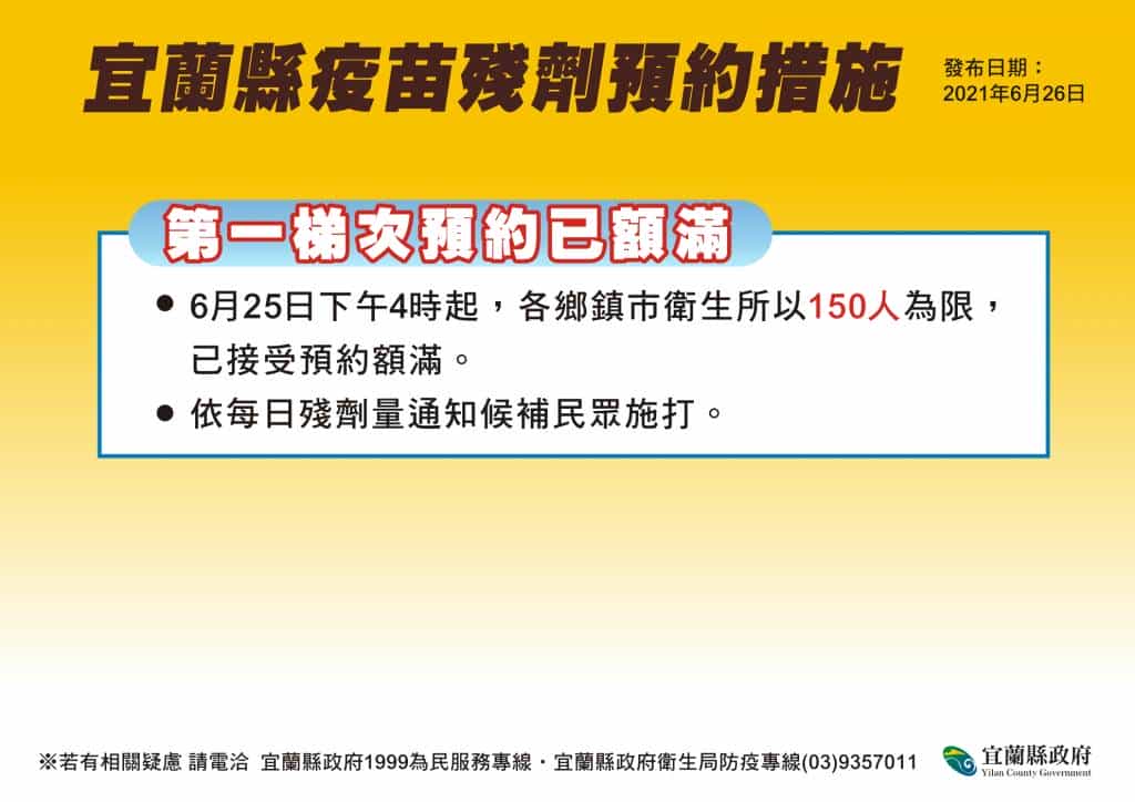 宜蘭縣12鄉鎮市衛生所昨(25)日下午四點開始,開放疫苗殘劑電話預約,第一梯次每所開放150個名額,各衛生所預約電話不斷,昨(25)日1800個已額滿,各衛生所殘劑共施打36人。縣府衛生局將視整體疫苗施打狀況滾動調整,等各所150名完成注射後,逐批開放名額接種。