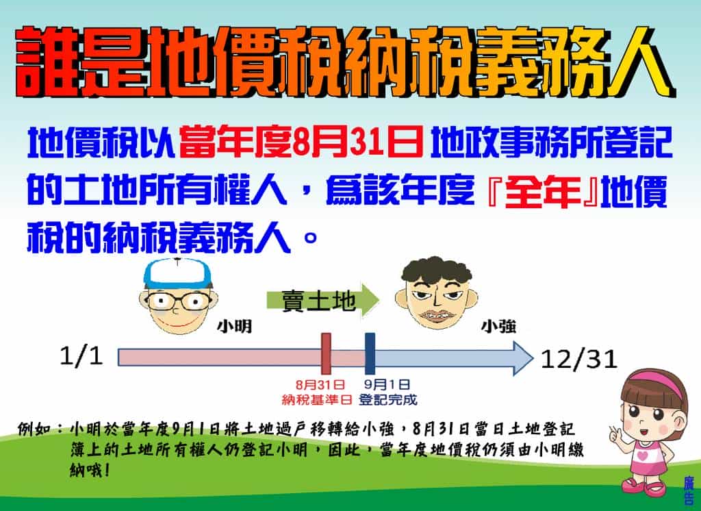 宜蘭縣政府財政稅務局表示,地價稅每年11月開徵,徵收期間為每年的1月1日到12月31日,依據土地稅法施行細則第20條規定,地價稅以8月31日為納稅義務基準日,也就是說8月31日當天土地登記簿上所記載的土地所有權人為當年全年度地價稅的納稅義務人。不論實際持有土地期間多久,皆須負責繳納該筆土地全年度地價稅,並非只繳納自取得土地後剩餘月數的地價稅。