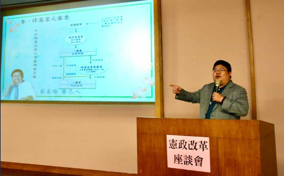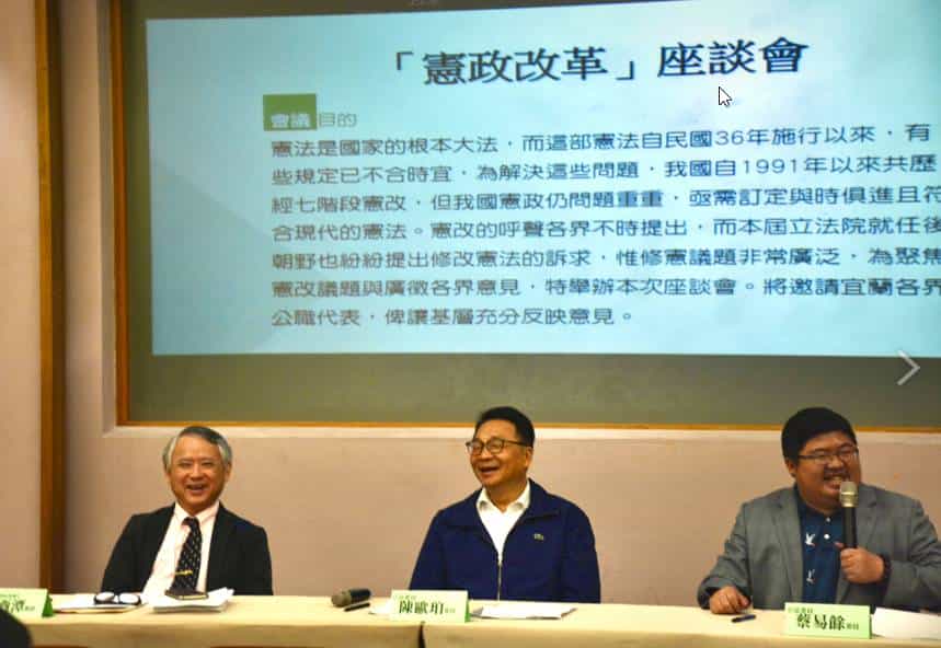 立法委員蔡易餘介紹憲政改革的歷史背景,在會中特別表示,目前憲改的最大問題是修憲的門檻,需經過出席立委3/4之決議,這代表著只要藍綠其中一方反對,提案就會被沒收,所以這次我們修憲委員會的共識是「理性討論,不杯葛」,另外法案在立法院通過後還需公民複決,需有效同意票過選舉人總額之1/2,代表著同意票需960萬票,我們以這次蔡英文總統選舉的得票數817萬票,中間還差距143萬票,這就是目前憲法修改的難處,同時也是需要重視與改變的地方。