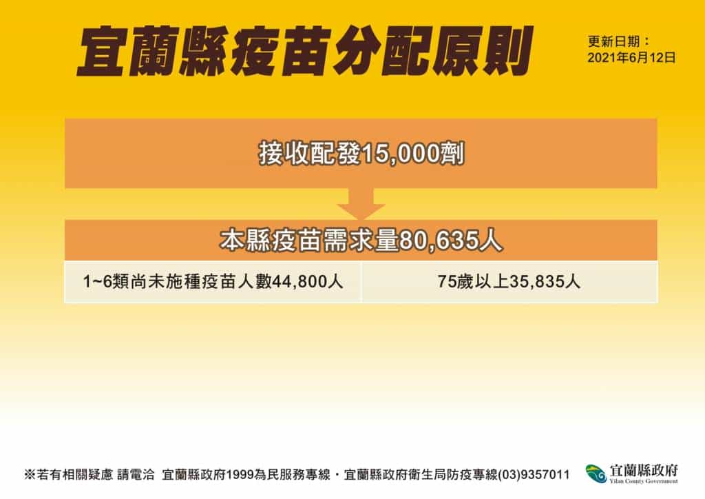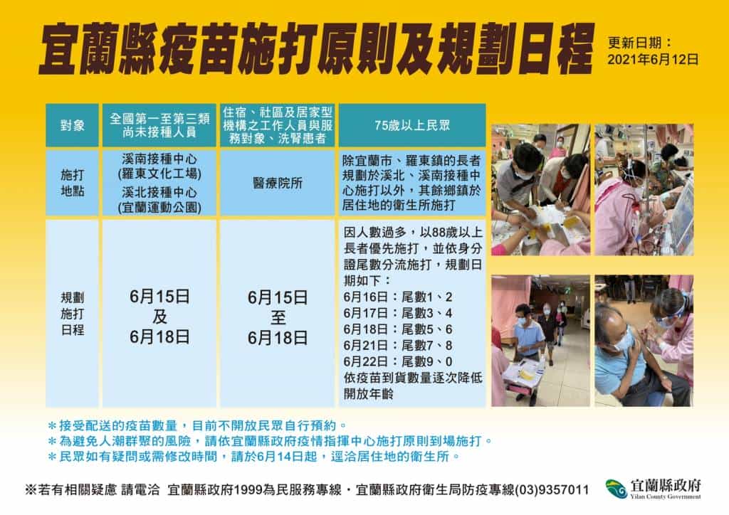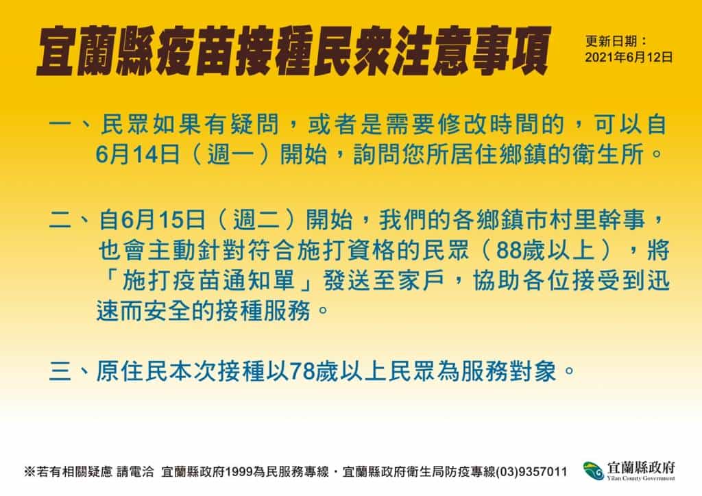 縣府指出,宜蘭市及羅東鎮的長者,將在溪北及溪南的接種中心進行,其他鄉鎮將以各鄉鎮的衛生所為接種場地。民眾如果有疑問,或者需要修改時間,自6月14日(週一)開始,詢問所居住鄉鎮的衛生所。而6月15日(週二)開始,各鄉鎮村里幹事會主動針對符合施打資格的民眾(88歲以上),將「施打疫苗通知單」發送至家戶,協助民眾接受迅速而安全的接種服務。