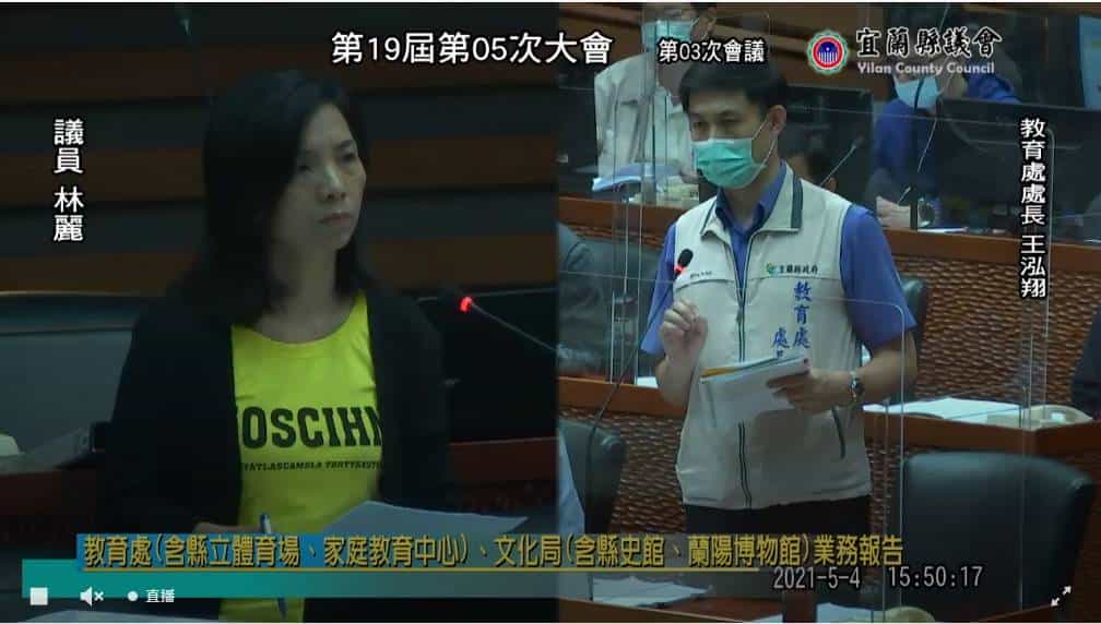 林麗議員舉例說明以宜蘭市復興國中「馥馨樓外牆磁磚剝落整建」、馬賽國小「群康樓、群信樓各樓層天花板水泥塊掉落」為例,復興國中只要300萬,縣府竟然拿不出來?