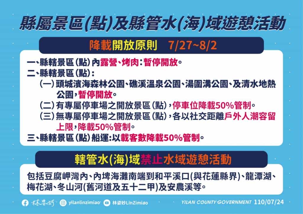 至於宜蘭縣轄景區及縣管水域、海域遊憩活動方面,自7月27日至8月2日採降載開放原則,縣轄景區內露營、烤肉暫停開放;頭城濱海森林公園、礁溪溫泉公園、湯圍溝公園及清水地熱公園也暫停開放;至於有專屬停車場的開放景區,採取停車位降載50%管制,包括五峰旗風景特定區、龍潭湖風景特定區、冬山河親水公園、冬山河生態綠舟、武荖坑風景區、豆腐岬;無專屬停車場的開放景區,各以社交距離戶外人潮容留上限,降載50%管制,包括維管束、丟丟噹廣場(含幾米廣場)、石牌縣界公園、梅花湖風景特定區、分洪堰公園、南澳農場。此外,縣轄景區船運方面則以載客數降載50%管制。