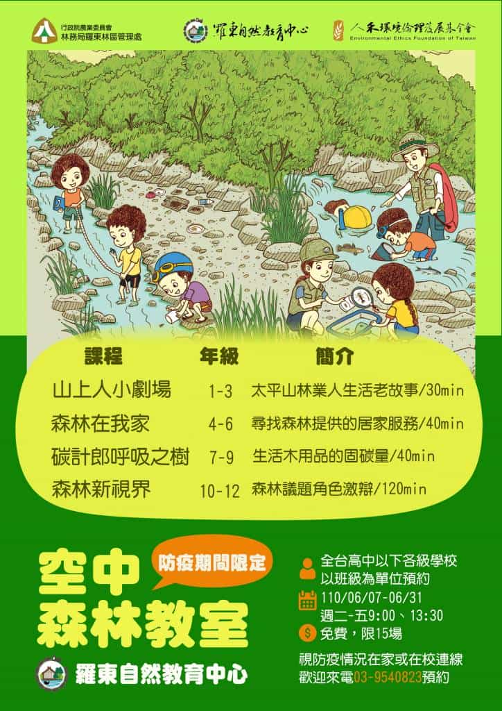 為配合居家防疫政策,各級學校目前皆採線上授課方式,讓學生們在家學習,羅東自然教育中心也秉持停課不停學原則,自6月7日起至6月30日止推出一系列免費且以森林為主題的「空中森林教室」線上環境教育課程,限額15堂,歡迎高中以下各級學校以班級為單位進行預約。