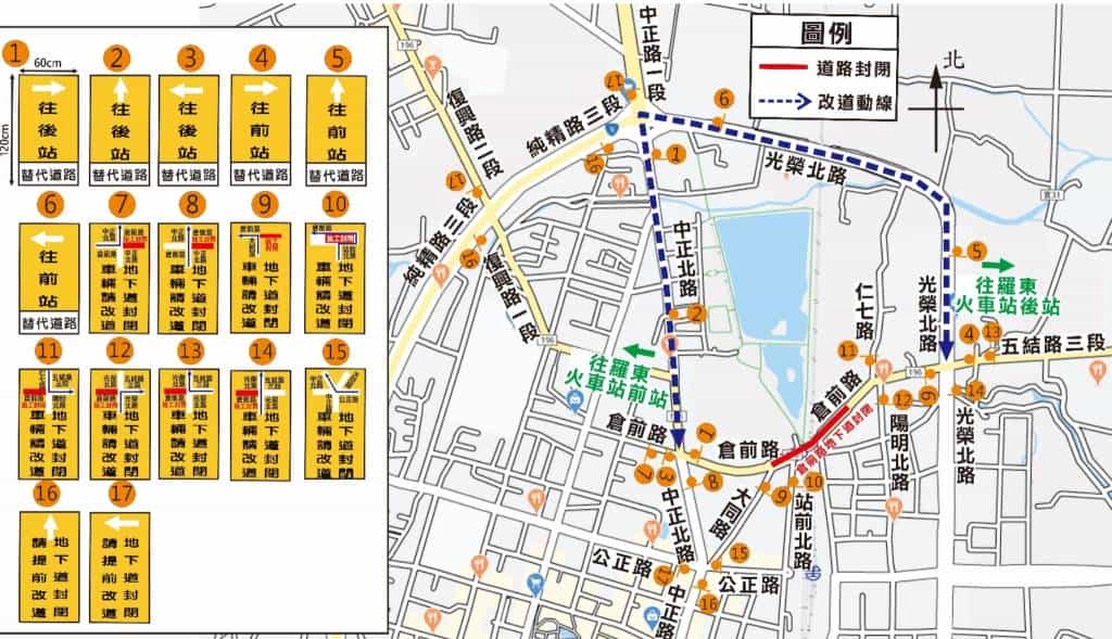 縣府提醒用路人,施工期間將採封閉倉前路地下道施作,為降低交通衝擊,縣府規劃車輛替代路線。另施工初期將於純精路與復興路、中正路與純精路、光榮北路與五結路及倉前路與中正北路等4處路口安排交管人員導引車輛,以降低地下道交通衝擊,請民眾配合改道。