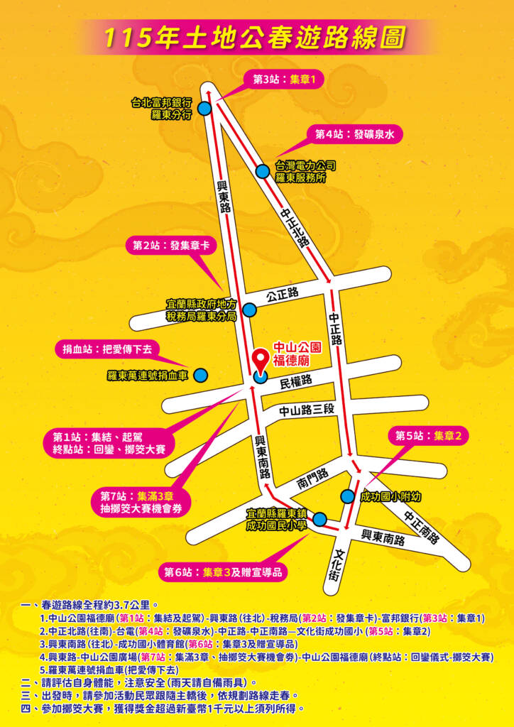 鎮長吳秋齡表示,此次活動訂於3月14日(六)上午8時30分從中山公園福德廟廣場迎神出發起駕「春遊羅東」,沿途經興東路–中正北路–中正路–中正南路–文化街–興東南路–興東路,回到中山公園福德廟,全程約3.7公里,參加民眾沿路線,途中需完成集滿活動3戳章,可兌換宣導品及平安麵龜,數量有限發完為止。