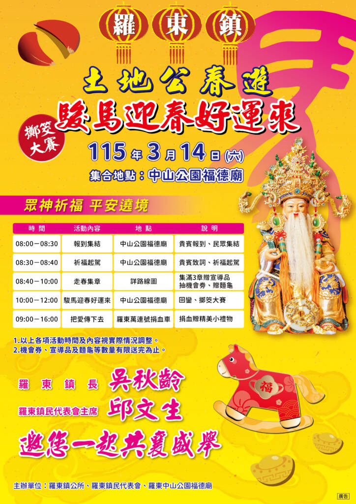 羅東鎮公所於農曆二月初二土地公誕辰期間舉辦土地公春遊活動,今年與羅東鎮民代表會訂於3月14日(星期六)共同舉辦115年「土地公春遊 駿馬迎春好運來」祈福活動。於今(5)日舉行活動記者會, 鎮長吳秋齡及主席邱文生等貴賓齊聚羅東中山公園福德廟前,為活動進行暖場說明,希望藉由此次土地公聖誕活動引領民眾,春遊羅東、駿馬迎春,祈福好運來。