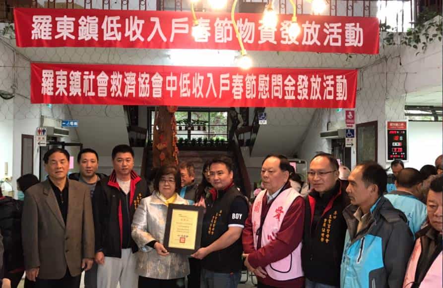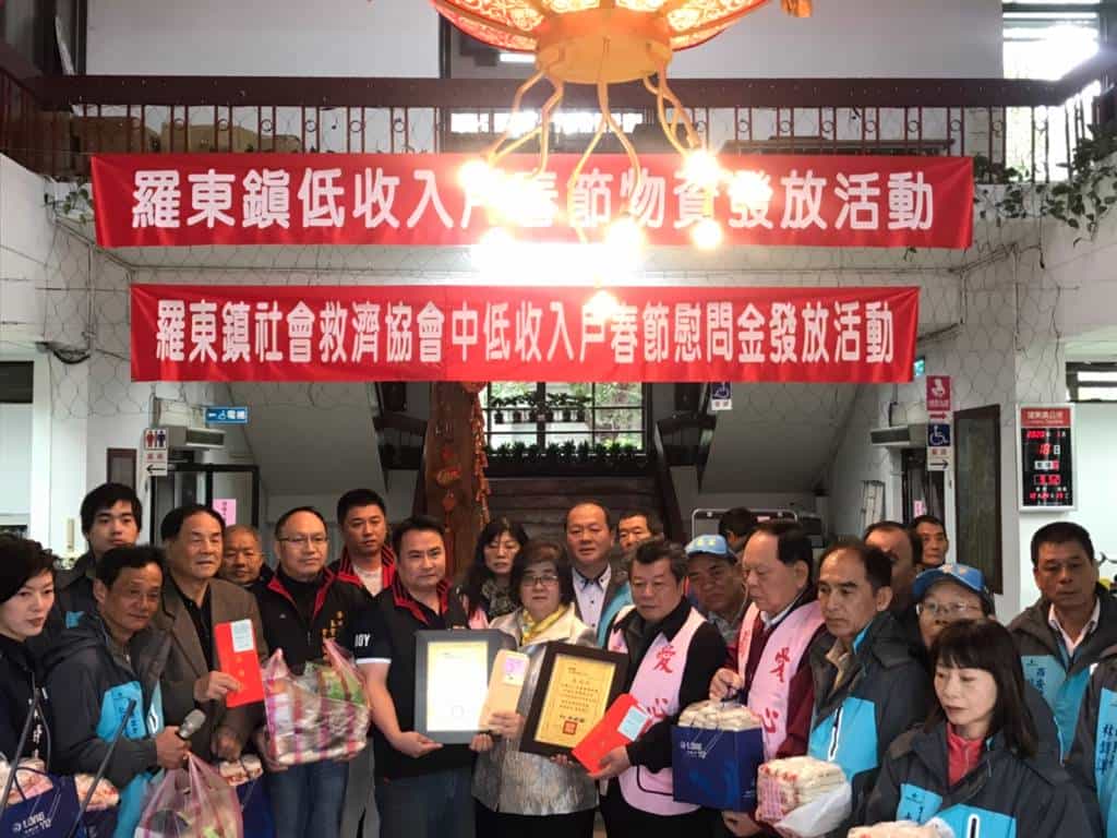 羅東鎮公所本著人飢己飢、人溺己溺之精神,結合各界善心人士物資,於春節前針對本鎮約321戶低收入戶每戶匯款春節慰問金1,500元,活動當日發放社會救助糧白米共2,940公斤、善心人士捐贈罐頭共3,528罐、紅富善坊教育基金會捐贈禮券共176,400元、新北市港口玉聖宮聖母會捐贈民生物資共60份。