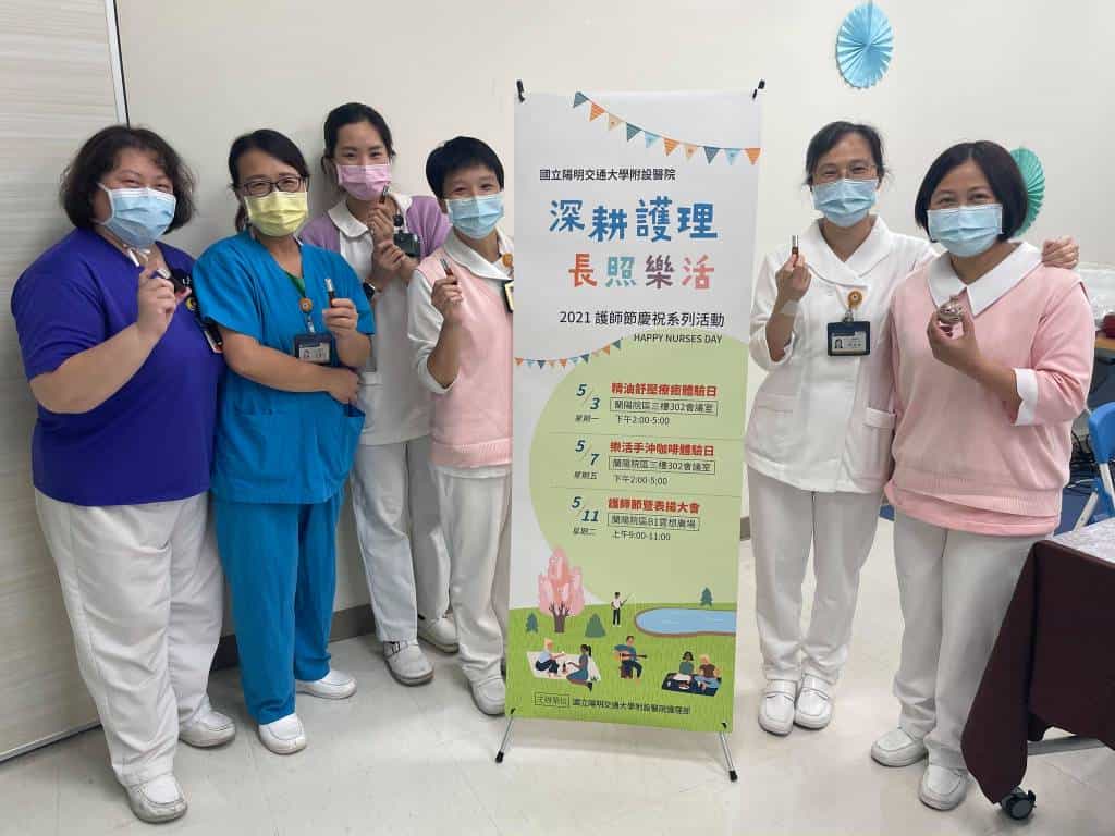 陽明交大醫院護理部主任林淑娟表示:該院今年為護理師們精心設計一系列的慶祝活動,包括:精油舒壓療癒體驗,讓高壓工作的護理師在音樂與精油結合之際享受片刻舒緩;樂活手沖咖啡饗宴,這種充滿東方神秘色彩、口感馥郁香氣迷魅的黑色飲料,受到許多護理師青睞品嘗,有助提振精神;護師節前夕,院方也致贈蛋糕與禮券,表達滿滿的感謝及祝福。