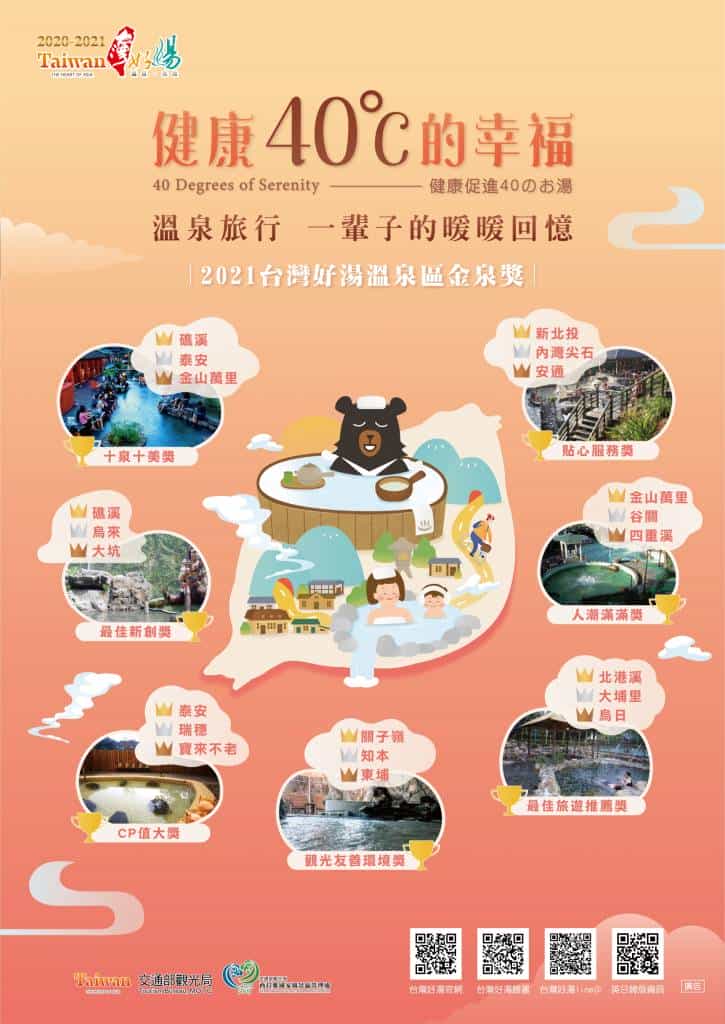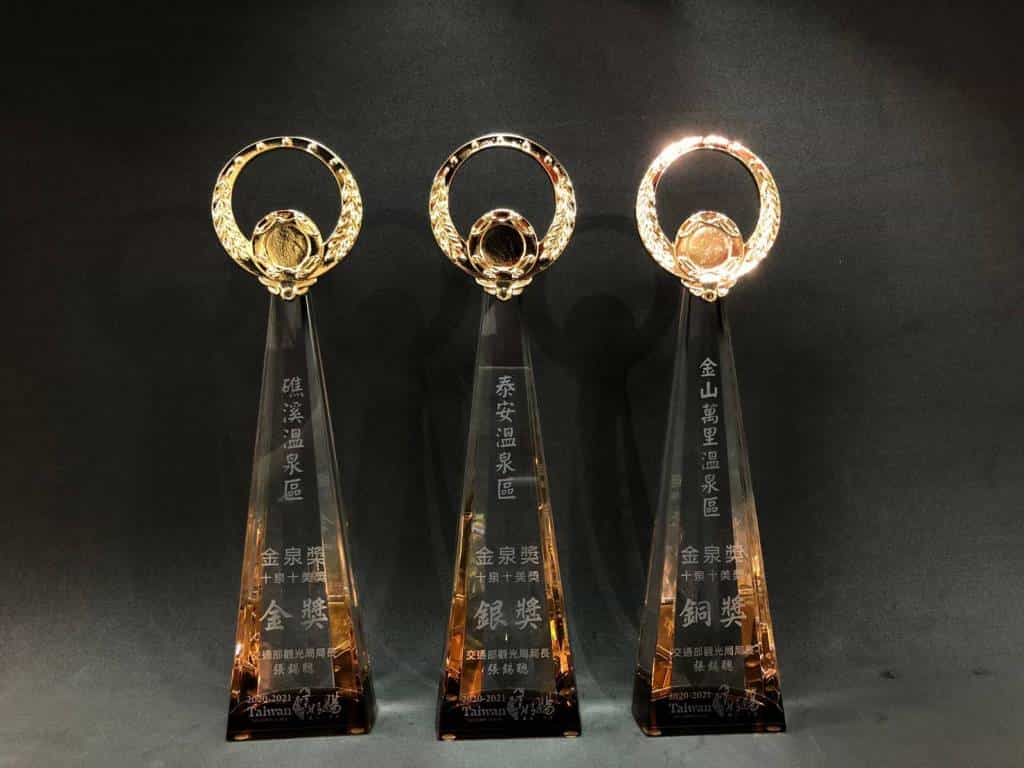 好湯金泉獎出爐~「礁溪溫泉」十全十美獎奪冠 交通部觀光局每年舉辦「臺灣好湯」活動行銷全臺灣的溫泉區,今(110)年舉辦 臺灣溫泉界最高榮耀-「金泉獎」評比活動。此次「金泉獎」最大獎-「十泉十美 獎」,在經過激烈競爭的民眾票選及專家評審後,由「礁溪溫泉」獲得十全十美獎 第 1 名,第 2、3 名分別由泰安、金山萬里溫泉區取得,「十泉十美獎」是集合所有項目綜合評分的獎項,礁溪溫泉此次得獎的溫泉區除了民眾票選第一名外,在各項分數中也都獲得評審一致好評。